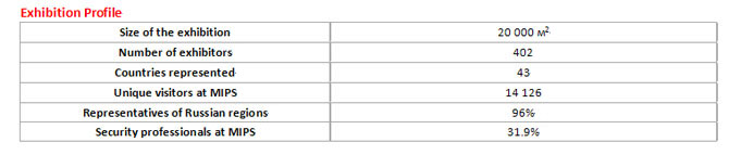 莫斯科安防展自1994年开办以来,成长明显,每一年有上千名国际外参展商参展。随其逐步名扬四海,展会范围逐年扩展。其大幅增添皆因俄罗斯安防产物需要的增添,和国际企业公司进入市场的数目增加。 RussCom IT Systems在第16届莫斯科安防展竣事后,实行了一项长达5个月的具体访客钻研,取样采访了517家公司(7%)(参与该展共有7384家公司)。 | ||