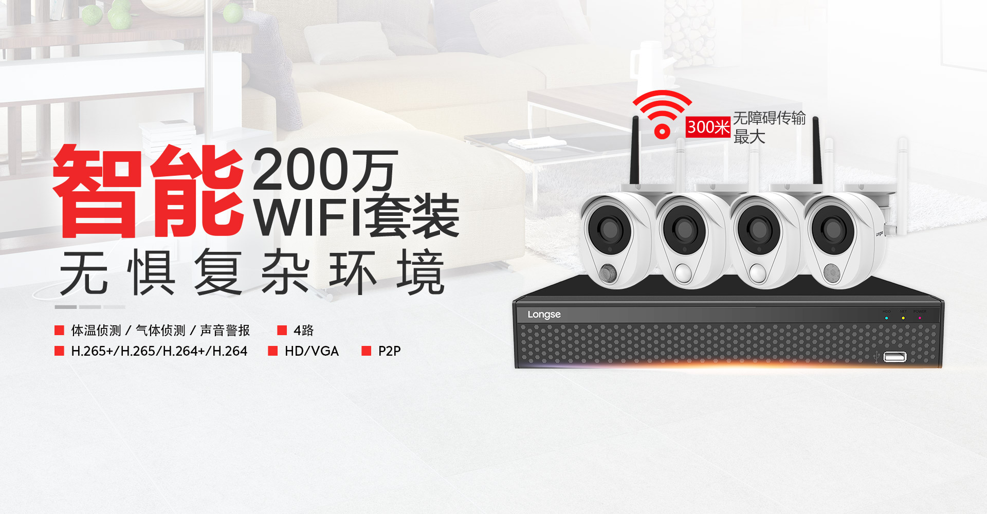 长视200万Wi-Fi智能监控套装,具有PIR传感器摄像机、气体侦测摄像机、声响报警摄像机,